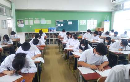 中間テストが、13日から行われています。本日は、社会、国語、技術家庭(1、2年)のテストがありました。写真は2年生のようすです。