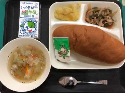 本日のメニューは、パン、牛乳、豚肉と野菜のケチャップソテー、スープ、スイートポテト、ソフトマーガリン、でした。