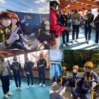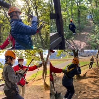 山の上まで車で登って、少しずつ滑車に乗って下ります!みんな着地が上手でした!(先生は3回失敗しました。)