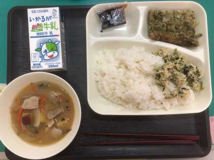 本日のメニューは、ごはん、牛乳、お好み焼き、豚汁、とりなっ葉いため、でした。
