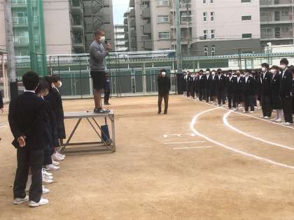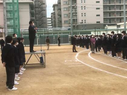 運動場で全校集会を行いました。
