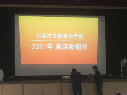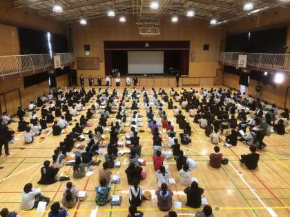 生徒会のあいさつ、校長先生の話、生徒指導主事古澤先生の話、その後、部活動紹介ムービーを上映しました。