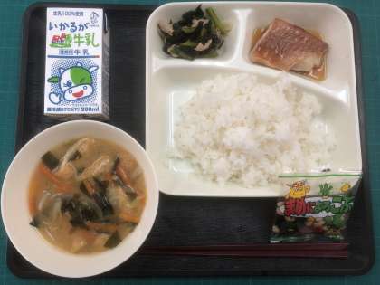 ごはん、牛乳、あかうおのしょうゆだれかけ、みそ汁、こまつなのいためもの、豆こんぶ(中)、でした。