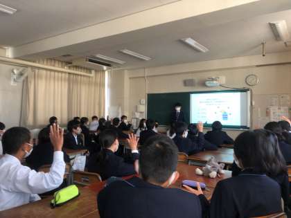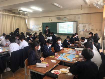 本日5、6限目に1年生はSDGsについての学習を行いました。講師の先生をお招きして、スライドやボードゲームを使って、SDGsについて学びながら活動しました。