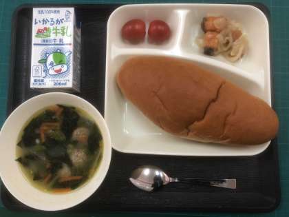 本日のメニューは、パン、牛乳、さけのマリネ、肉だんごと麦のスープ、プチトマト、でした。