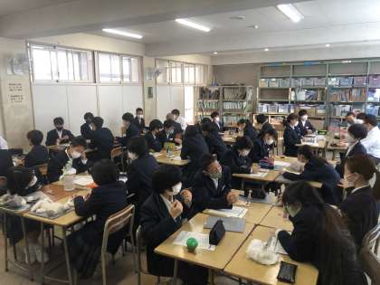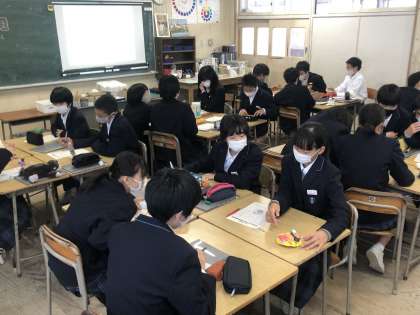1日6限目の美術の授業です。粘土を使った自分の作品をグループで紹介し合っています。