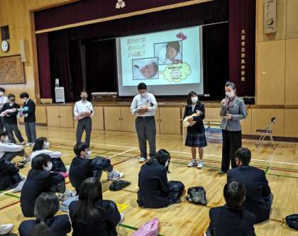 このあと、各教室でも、アンケートのあとで人形の赤ちゃんを抱く体験をしました。子どもを産み育てる大変さ、責任の重さや生命の不思議について学ぶことができました。