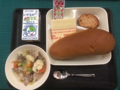 本日のメニューは、パン、牛乳、とうふハンバーグ、カリフラワーのスープ煮、スライスチーズ、でした。