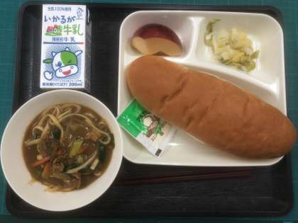 本日のメニューは、パン、牛乳、カレーうどん、はくさいの甘酢あえ、りんご、ソフトマーガリン、でした。