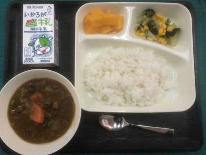 本日のメニューは、牛乳、冬野菜のカレーライス、ブロッコリーとコーンのサラダ、黄桃(カット缶)、でした。