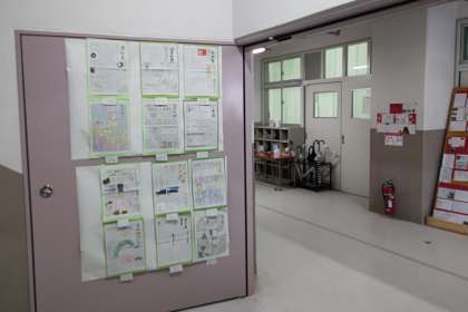 文化発表会で学年で制作した、ストローアートも展示しています。西淀川区の形を生かしてクジラをつくっています。