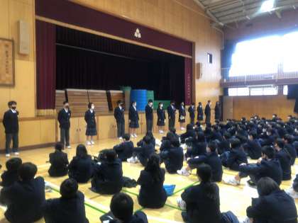 本日朝、1年生は学年集会を行いました。今日は各クラスの委員長が2学期の学級を振り返って、頑張ったこと、3学期への課題について報告しました。
