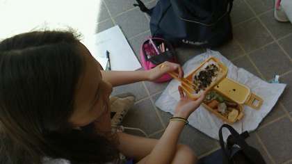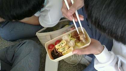 廊下で、体育館前で、校舎のあちらこちらで車座になっての友達とのランチタイムです。保護者の愛情をたっぷり注いでもらった手作り弁当を、ほおばる生徒の表情はいいものです。