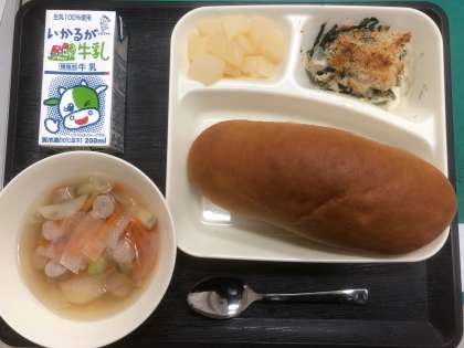 本日のメニューは、パン、牛乳、マカロニグラタン、ウインナーのスープ、和なし、でした。