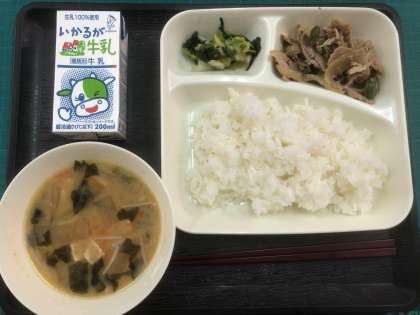 本日のメニューは、ごはん、牛乳、豚肉のごまだれ焼き、みそ汁、きくなとはくさいのおひたし、でした。