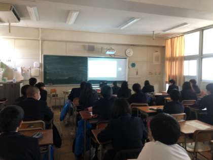 2月18日、1年生は防災学習を行いました。追手門学院大手前中高等学校の先生にお越しいただき、東日本大震災での映像や資料から、震災の様子や避難に対する課題について学び、今後起こりうる南海トラフ地震に備えるための学習を行いました。臨場感のある映像や命に関わるお話しに生徒たちも真剣に授業に臨みました。