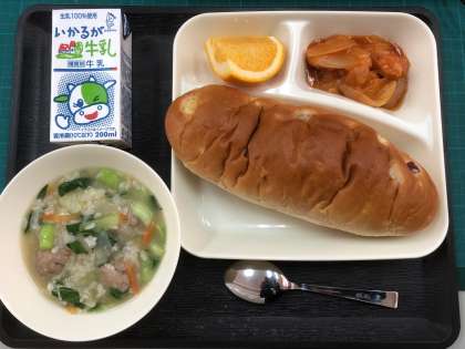 本日のメニューは、パン、牛乳、えびのチリソースいため、中華がゆ、はっさく、でした。