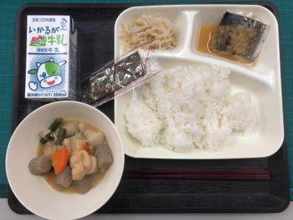 本日のメニューは、ごはん、牛乳、さごしのおろしじょうゆかけ、一口がんもとさといものみそ煮、もやしのゆずの香あえ、でした。