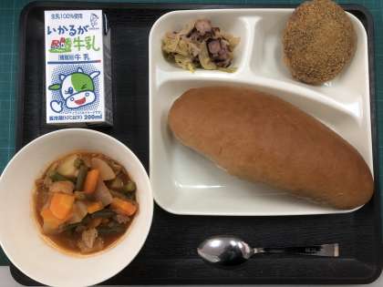 本日のメニューは、パン、牛乳、チキンレバーカツ、ケチャップ煮、たことキャベツのバジルソテー、でした。