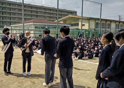 修了式を控えた全校生徒の前で、漫才を披露していただき、じゃんけんでゲームをして、優勝した生徒に記念品も渡されました。