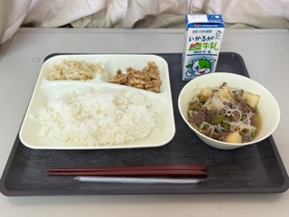 ご飯、牛乳、肉じゃが、もやしのゆずの香あえ、ごまかかいため
