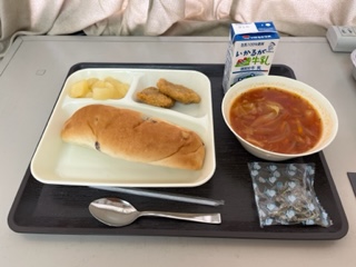 レーズンパン、牛乳、一口トンカツ、ミネストローネ、ミニフィッシュ、洋なし。