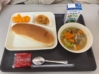 コッペパン、いちごジャム、牛乳、豚肉と野菜のカレースープ煮、変わりピザ、みかん(缶)