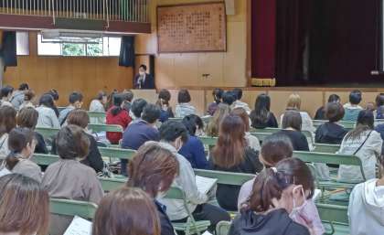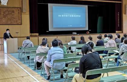 14日に修学旅行保護者説明会を行いました。分部先生から、配付したプリントとスライドを使い、修学旅行の目的や行程、持ち物、注意点などを話しました。