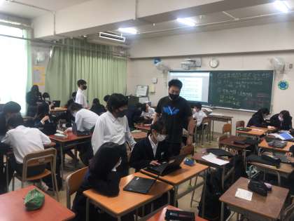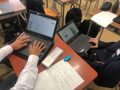 出発の時間や、電車に乗る時間などをクロームブックを使って調べています。