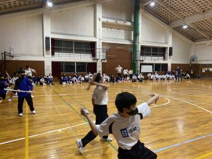 槍(新聞紙を丸めて筒状にしたもの)を投げて飛距離をきそいます。