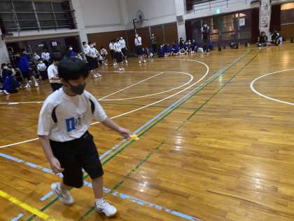 ピンポン玉ががバトン代わりになります。男子全員が参加します。