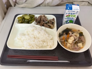 ごはん、牛乳、プルコギ、とうふとわかめのスープ、きゅうりの甘酢づけ。