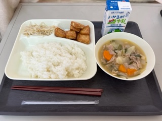 ごはん、牛乳、中華煮、あつあげのピリ辛じょうゆかけ、もやしの中華あえ。