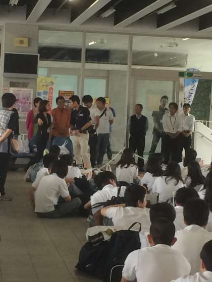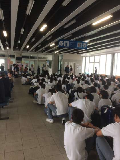 雨のためテープはなしになりましたが、宿舎の人が見送りに来てくれています。ありがとうございました。