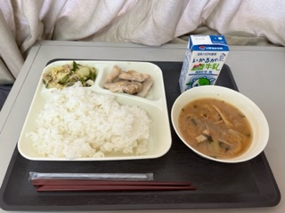ごはん、牛乳、鶏肉のおろしじょうゆかけ、みそ汁、野菜いため。