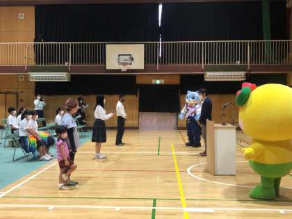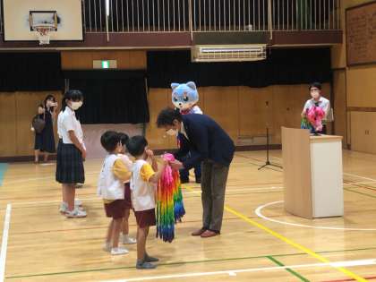 本日放課後、歌島中学校の体育館で、歌島中学校、西淀中学校の生徒会役員と、野里幼稚園の園児たちが集まり、西淀川区に向けて千羽鶴の贈呈式を行いました。