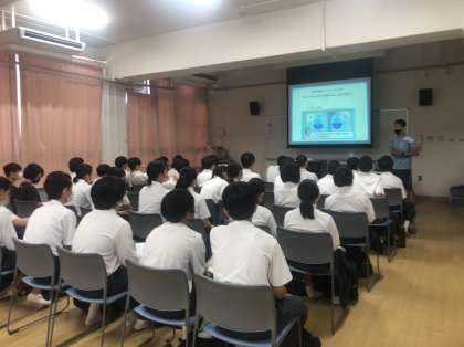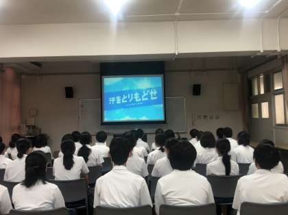 本日、各部活動の2年生の代表生徒を対象に、部活動会議として熱中症予防講座を行いました。