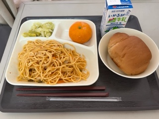 パン(1/2)、牛乳、チキントマトスパゲッティ、グリーンアスパラとキャベツのサラダ、みかん(冷)。
