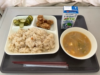 かやくご飯、牛乳、豚肉のたつたあげ、みそ汁、きゅうりの甘酢づけ。