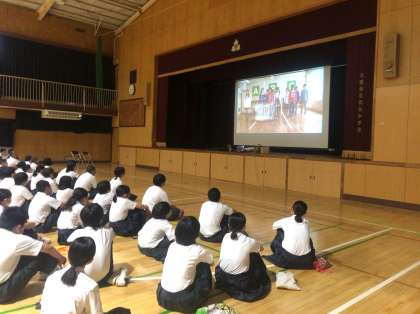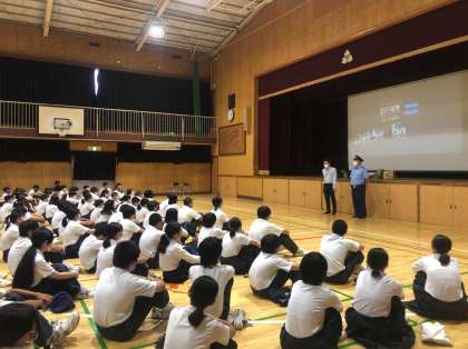 7月5日、6限目に2年生は防犯教室を行いました。西淀川警察のかたにお越しいただき、映像を見ながら、実際に犯罪を犯さなくても罪を問われる場合や、夏休みを迎えるにあたってトラブルに巻き込まれやすい事案などをお話しいただきました。