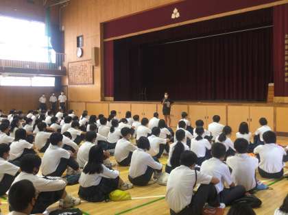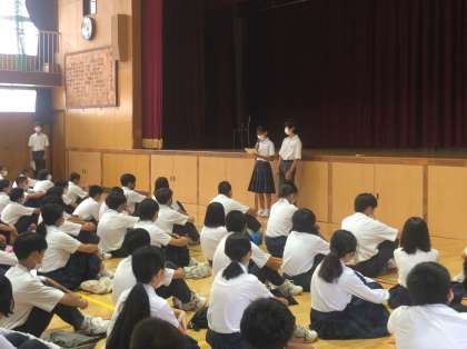 本日、2年生は体育館で学年集会を行いました。整美委員からは、教室や廊下でゴミがないように心掛けましょう。スリッパの向きをきちんと揃えましょう、と話しました。