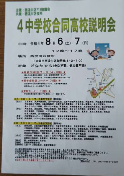 3年生の保護者の皆さまに、「西淀川区4中学校合同高校説明会」のご案内と「第1回進路説明会」資料を配付しました。