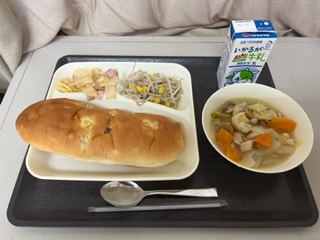 おさつパン、牛乳、鶏肉とてぼ豆のスープ煮、じゃがいもとトマトのチーズ焼き、もやしのコーンのソテー。
