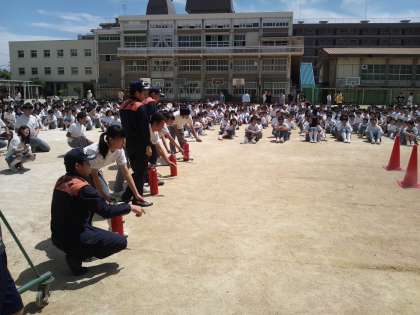 6月29日(月)13時25分に体育館横のクラブ倉庫より出火したと想定した避難訓練です。連続ベルと放送を使用して、担任の誘導で避難経路に沿って運動場に避難し、点呼・安全確認をしました。