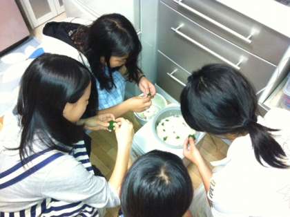 摘んできた よもぎ をお餅と混ぜてよもぎ餅を作らせてもらっています。