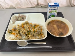 他人丼、牛乳、とうがんのみそ汁、キャベツの赤じそあえ。