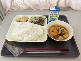 ごはん、牛乳、一口がんもとさといもの味噌煮、牛肉と野菜のいためもの、みたらしだんご、焼きのり。