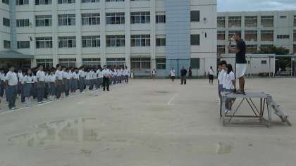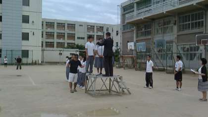 7月6日(月)は梅雨空の谷間で、グランドには水たまりもありましたが通常の場所から移動して、全校集会を行いました。