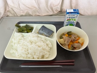 ごはん、牛乳、さごしの塩焼き、豚肉とじゃがいもの煮もの、オクラのいためもの。