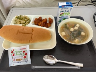 パン、牛乳、ヤンニョムチキン、もやしととうふのスープ、切り干しだいこんのナムル。